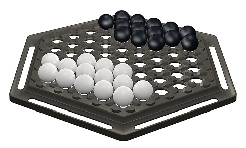 Sur un plateau hexagonal comprenant des billes noires et blanches, deux camps s’affrontent. Votre objectif : pousser six billes adverses dans les glissières au bord du plateau. Affûtez votre attaque et peaufinez votre défense. Observez, planifiez…et pesez bien vos options à chaque coup !