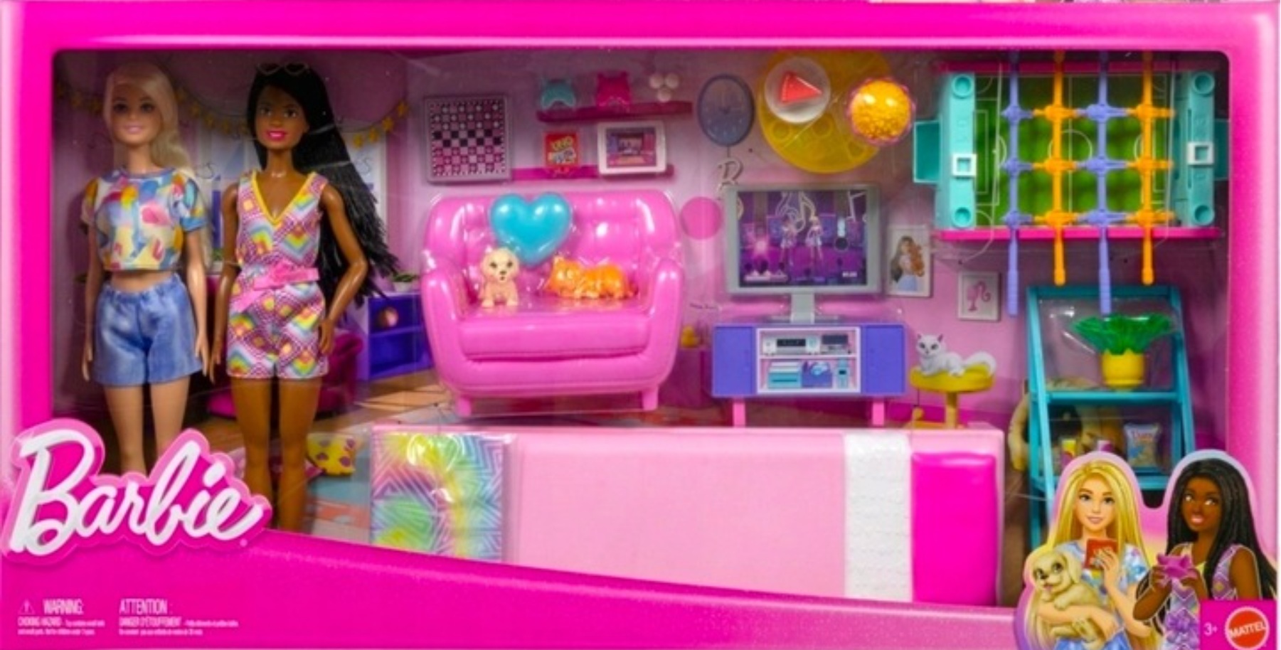 Coffret Barbie : Le grand Séjour et la chambre à Couché + 22 accessoires + 2 poupées mannequins.