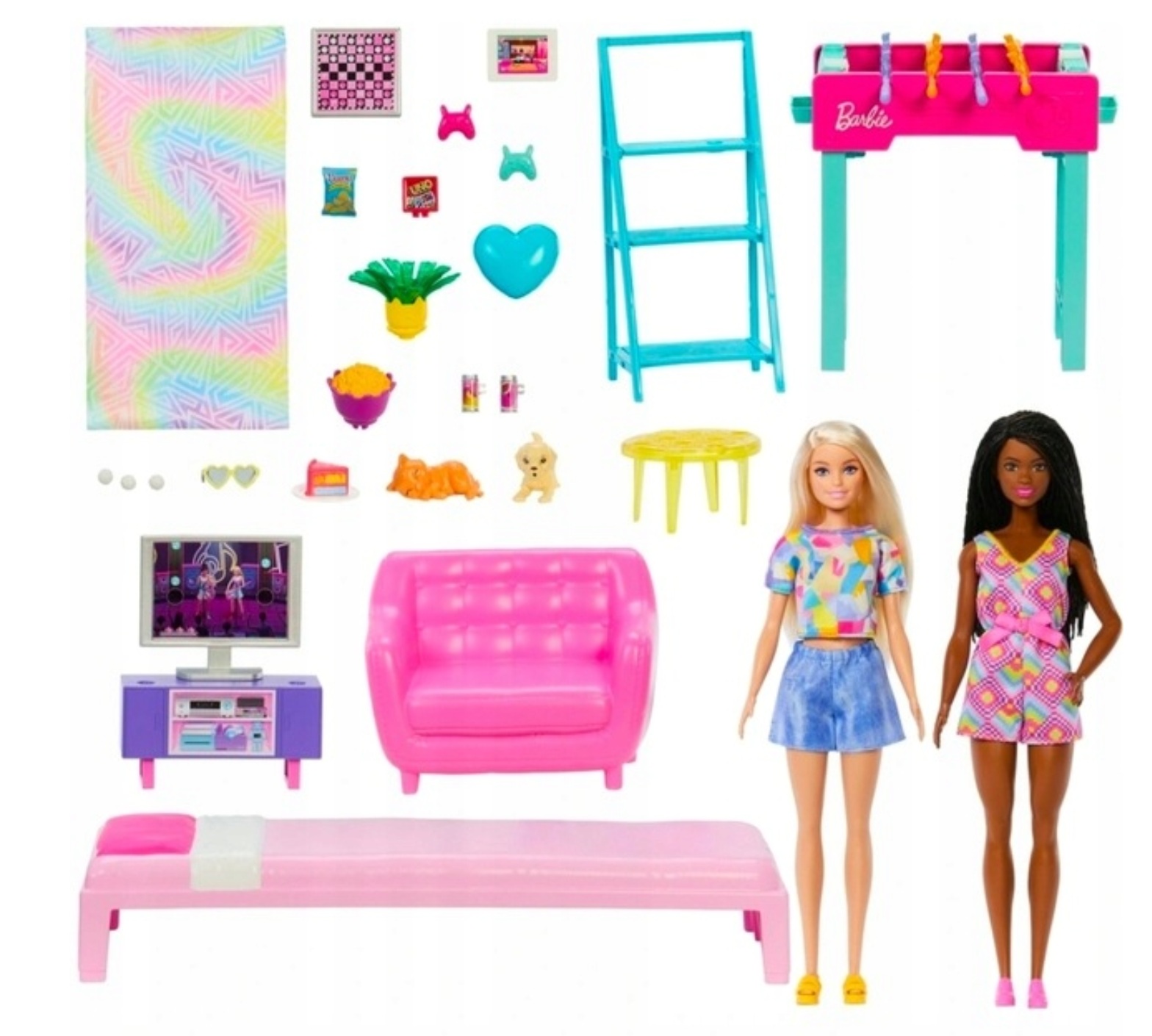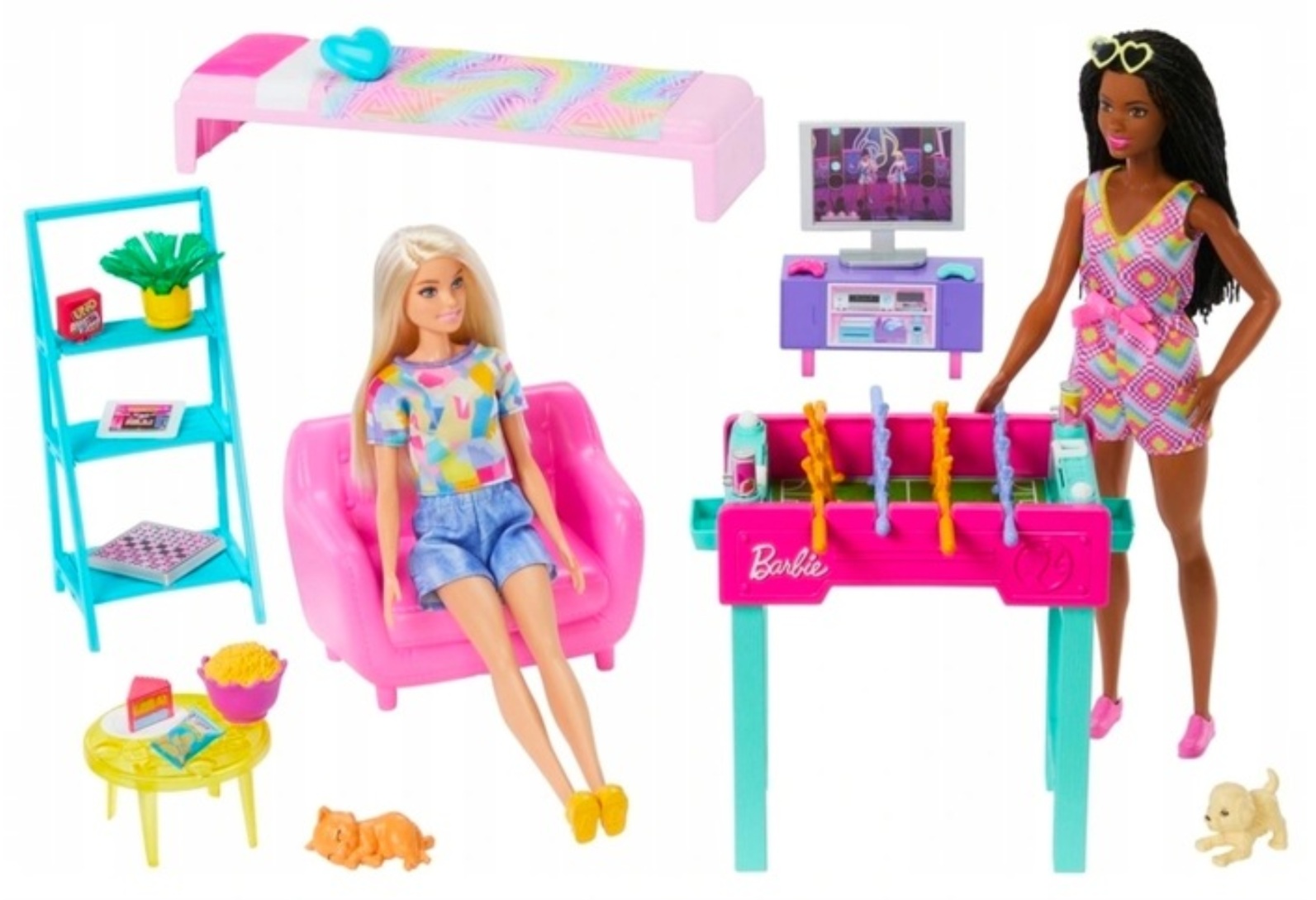 Barbie est prête à passer un moment inoubliable avec une table de baby-foot fonctionnelle, une télévision avec console et manettes de jeux, ainsi que des jeux de société.
