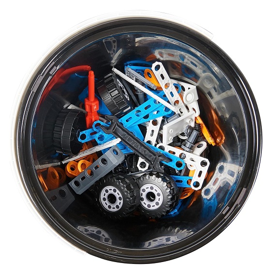 Le baril contient 150 pièces en plastique, 2 vrais outils et 1 notice de montage pour 3 modèles (un seul modèle peut être construit à la fois).