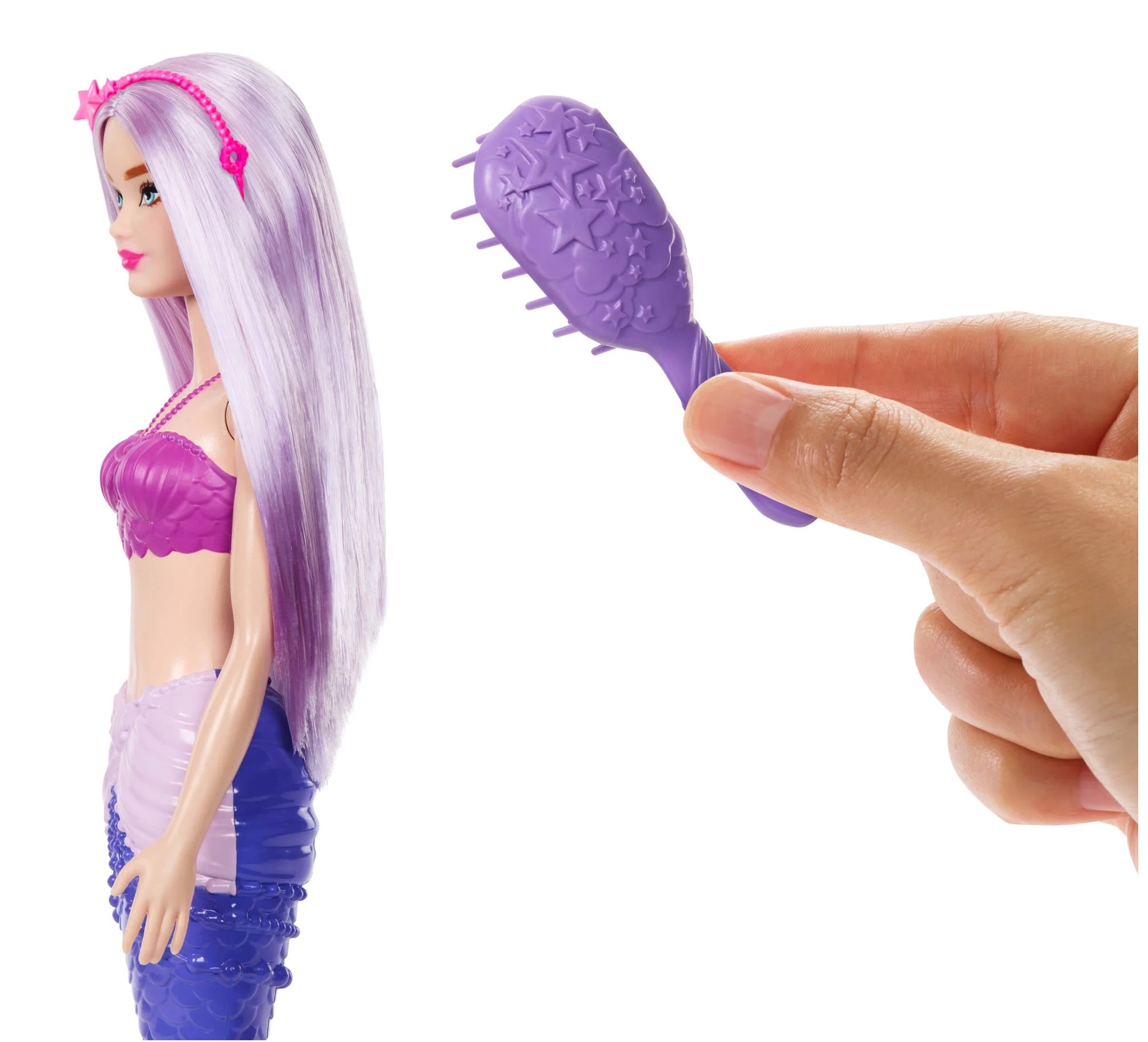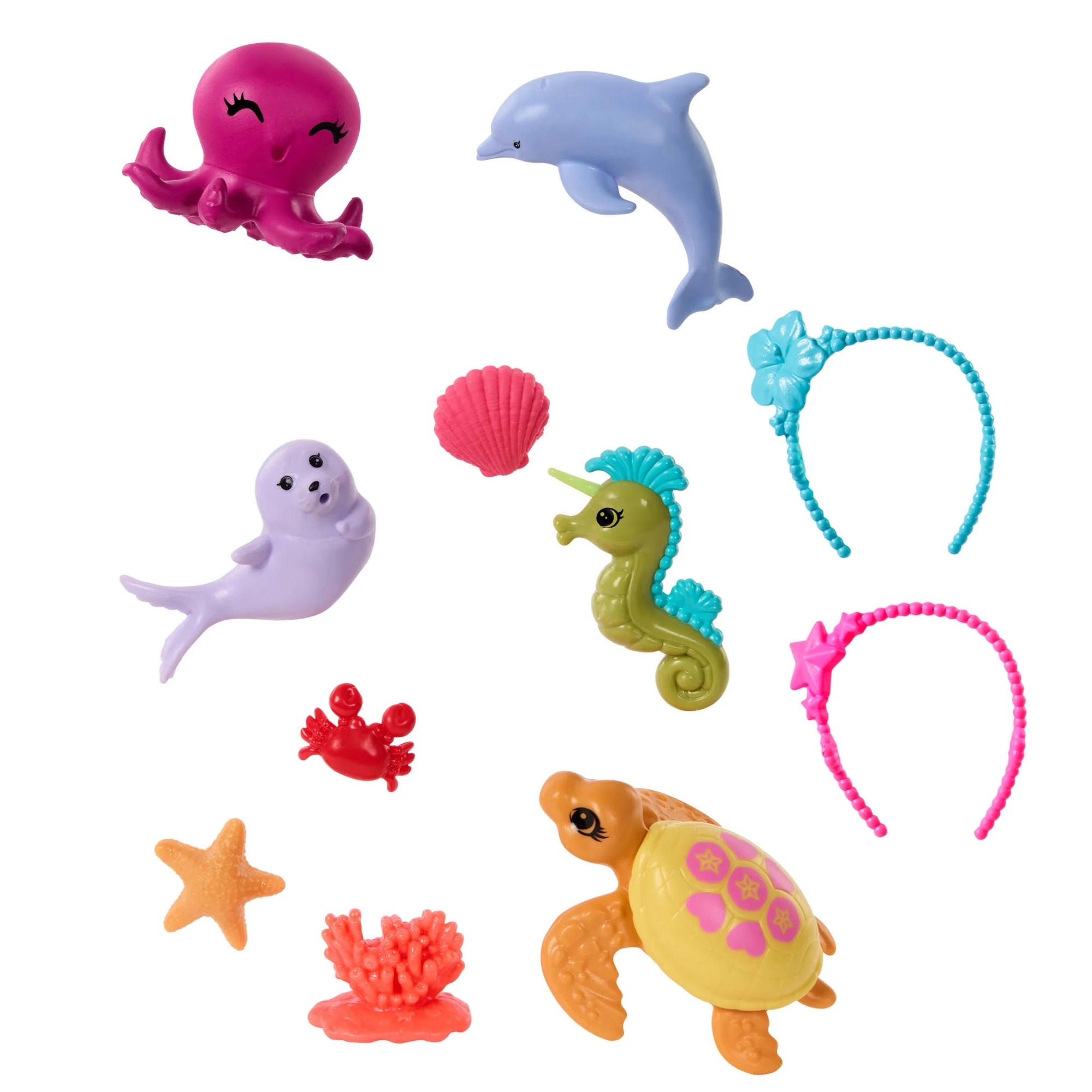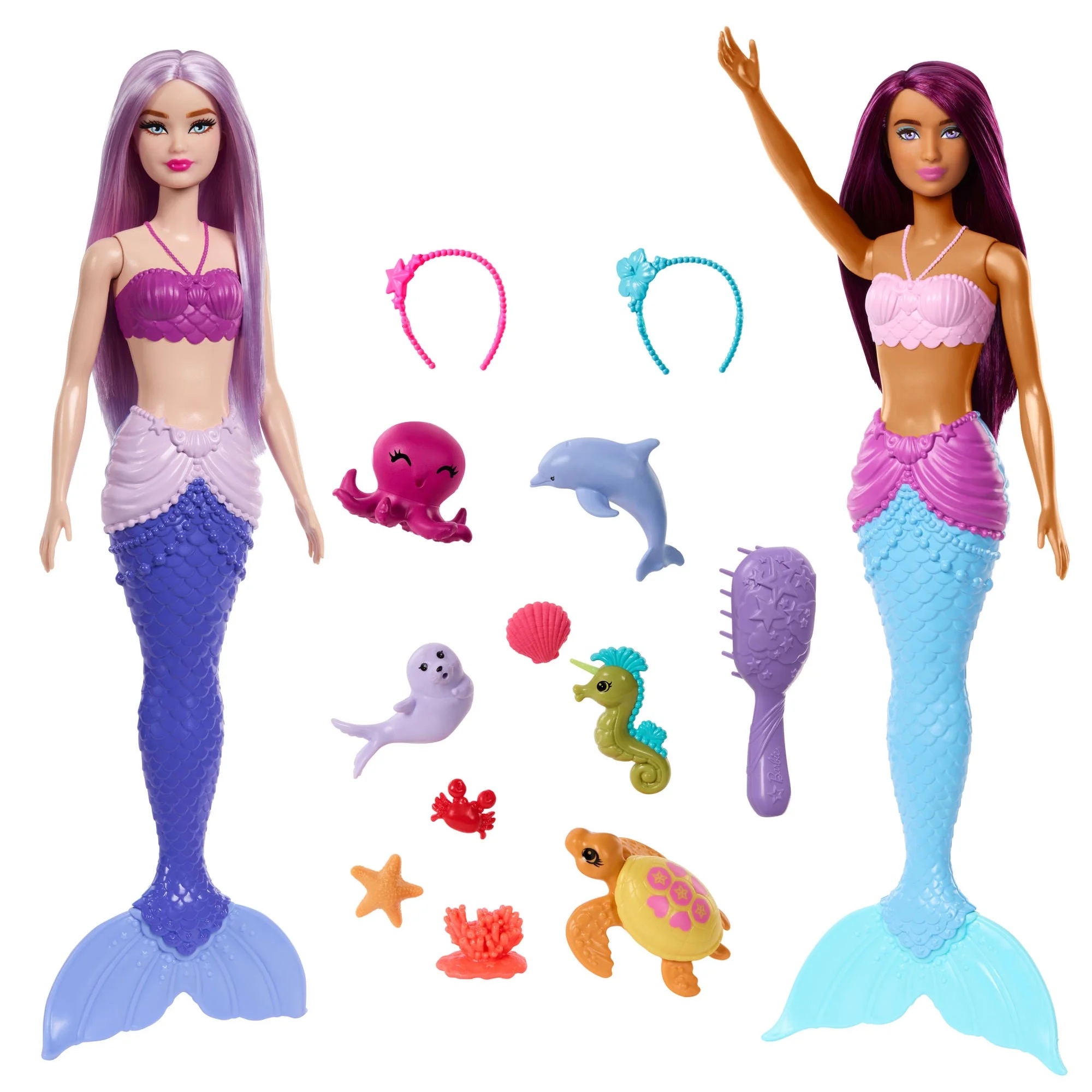 Le coffret comprend : 2 poupées Barbie sirène articulée, un poulpe, un dauphin, un hippocampe, une otarie, un crabe, une étoile de mer, un coquillage et 2 accessoires.