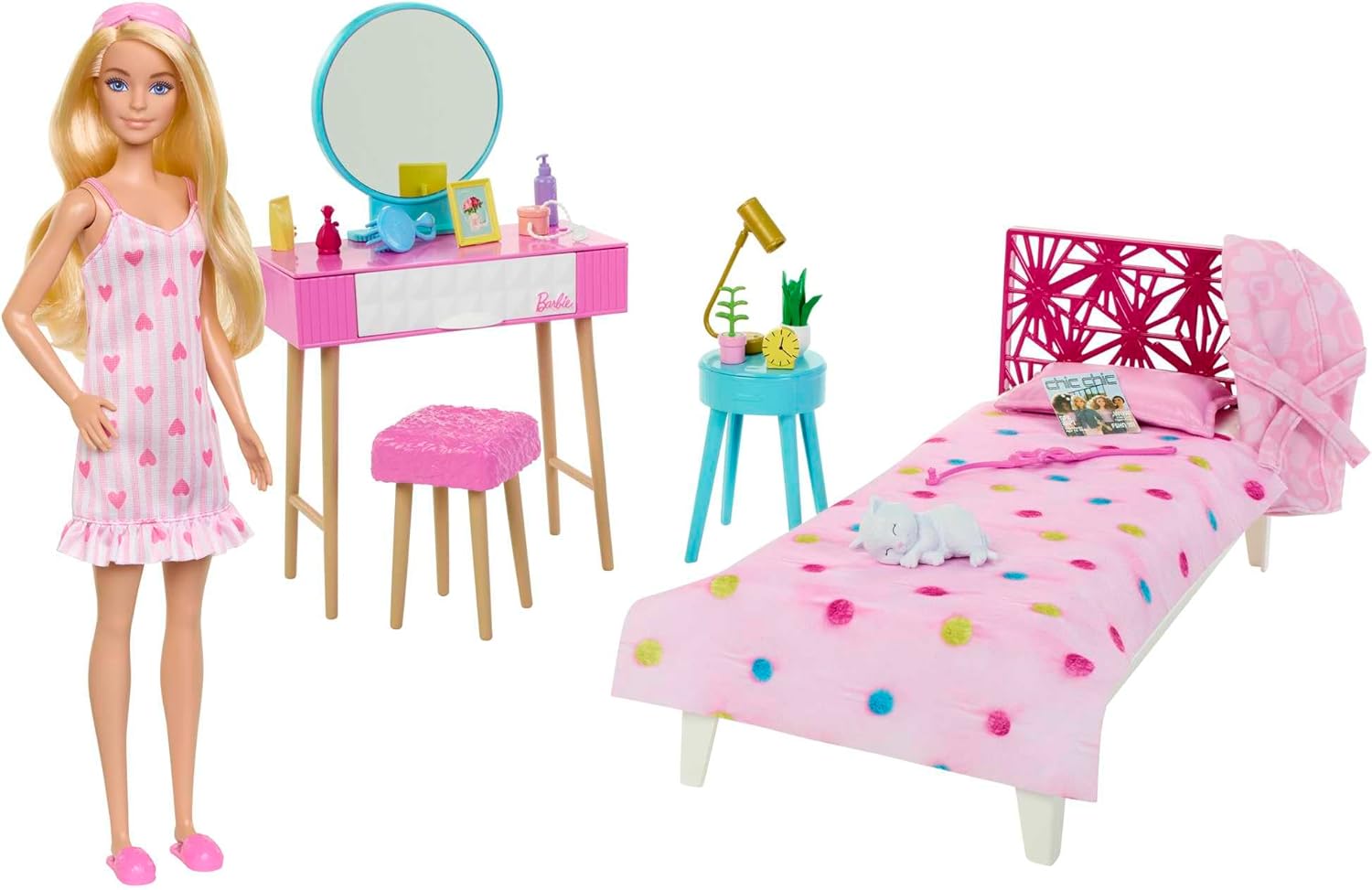 Coffret Barbie : la chambre à couché + coiffeuse + poupée mannequin + chat + 18 accessoires - Mattel - HPT55