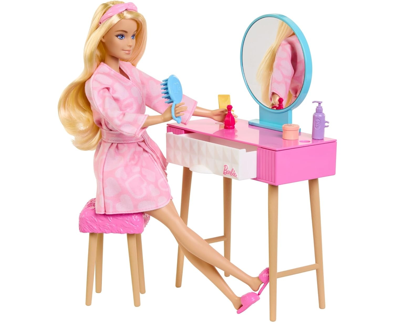 Des meubles comme un lit, une table de chevet et une coiffeuse plantent le décor pour toutes sortes de jeux de rôle. Barbie peut se préparer pour sa journée ou se reposer devant un magazine et un chocolat chaud le soir venu.