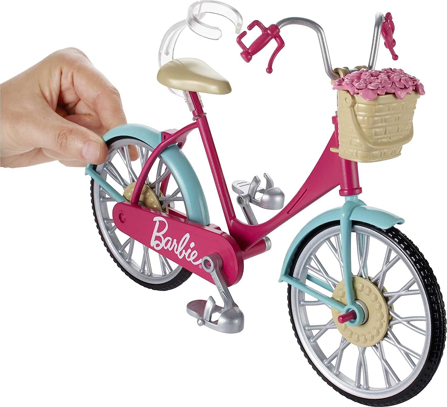 Roule vers de nouvelles aventures avec cette bicyclette Barbie ! Un superbe cadre rose, des garde-boue bleus et des touches argentées ! Les pédales et les roues permettent au vélo de rouler à toute allure ! Clippe ta poupée Barbie (vendue séparément) sur le siège de son vélo. Glisse ses pieds dans les pédales et ses mains sur le guidon, et en route ! La poupée Barbie est protégée par un casque bleu. Son vélo est équipé à l'avant d'un superbe panier avec des fleurs roses ! Les deux éléments peuvent être retirés pour jouer. Pour une petite promenade ou pour un long voyage, ce vélo t'emmènera partout ! Comprend la bicyclette de Barbie, son panier et ses fleurs, ainsi qu'un casque. La poupée n'est pas incluse. Les couleurs et les décorations peuvent varier.