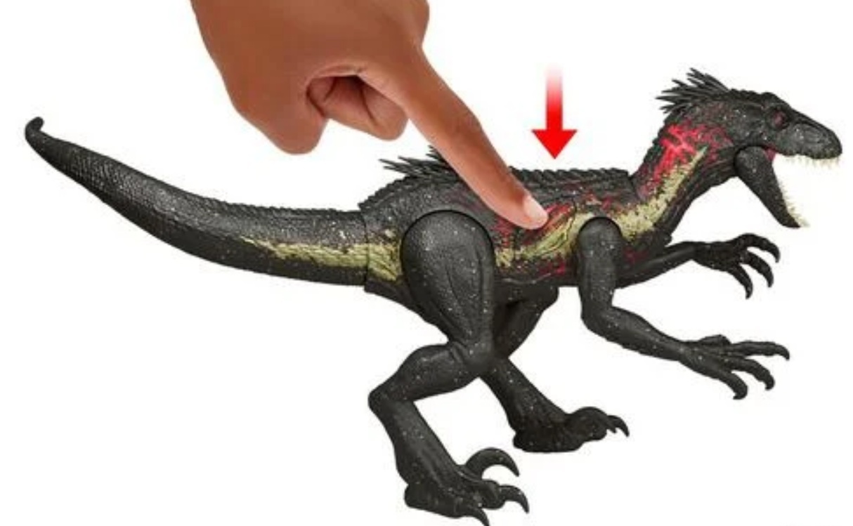 Le dinosaure peut tenir sur ses deux pattes arrière ou s’accroupir près du sol. Lève l’une de ses deux pattes pour faire tourner sa tête de l’autre côté et relâche-la pour qu’il frappe ! Ces attaques latérales déclenchent un rugissement et font briller ses yeux rouges ! Appuie sur le bouton situé sur son dos pour qu’il donne un coup de mâchoire !