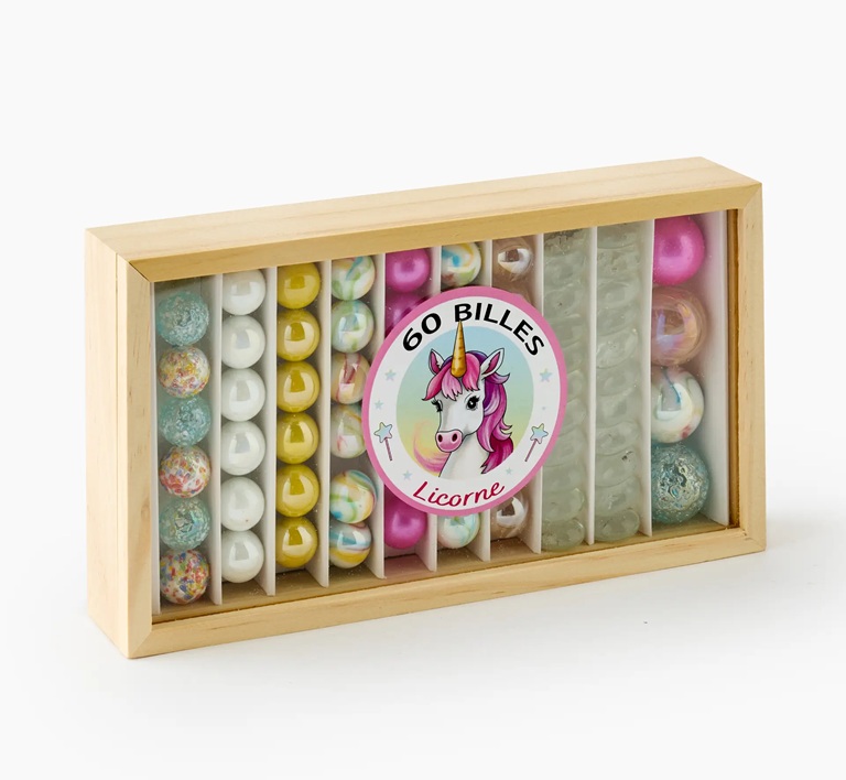 Avis aux chasseurs d’arc-en-ciel ! Cette licorne ne fait pas que galoper dans les nuages, elle vous offre un trésor de 60 billes dans un coffret féérique en bois compartimenté.