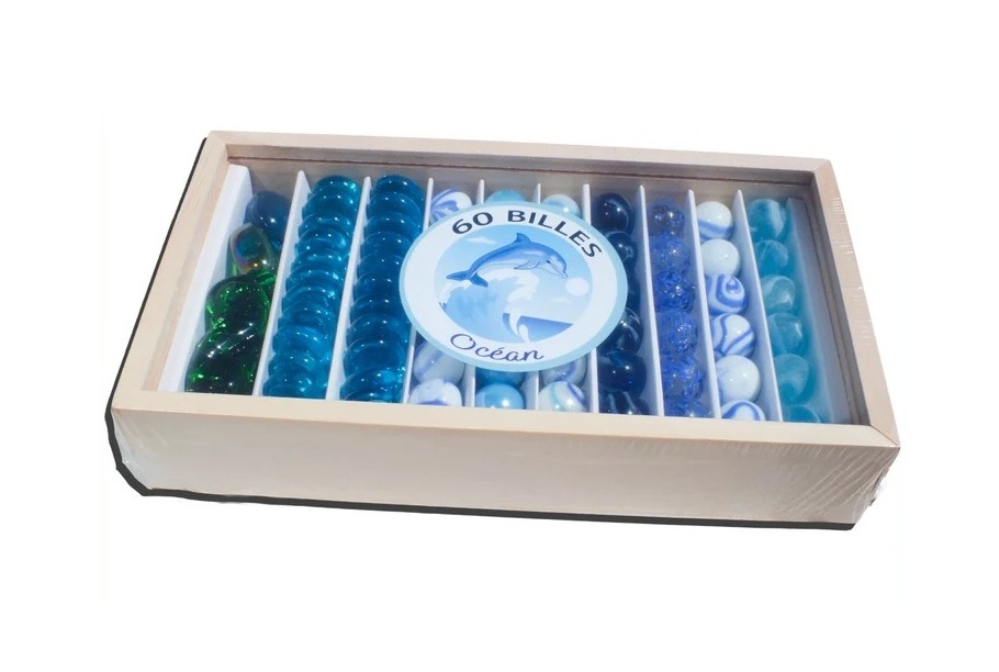 Un assortiment de 60 billes aux reflets marins présentées dans un coffret en bois compartimenté pour une meilleure organisation. Les billes en verre sont de formes, tailles et couleurs variées.