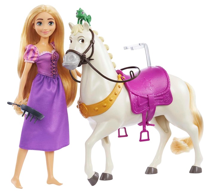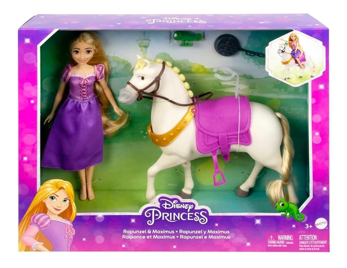 La poupée Raiponce a les genoux articulés pour monter Maximus et elle porte un habillage en tissu violet fidèle à sa tenue dans le film. Elle a de très longs cheveux et est fournie avec une brosse en forme de poêle pour que les enfants s’amusent à la coiffer.