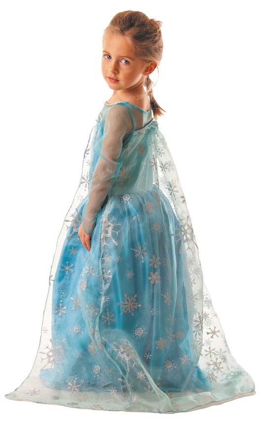 Une longue cape en voile bleu et imprimée de flocons argentés est cousue au dos de la robe.
