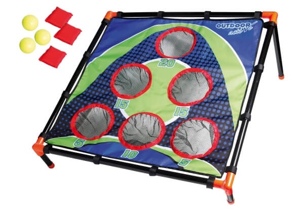 Ce jeu d’adresse, simple et amusant, risque bien de révéler l’esprit de compétition des petits comme des grands. Il se compose d’une cible sur pied (à assembler) avec 6 filets de réception, 3 sacs lestés et 3 balles souple en plastique.