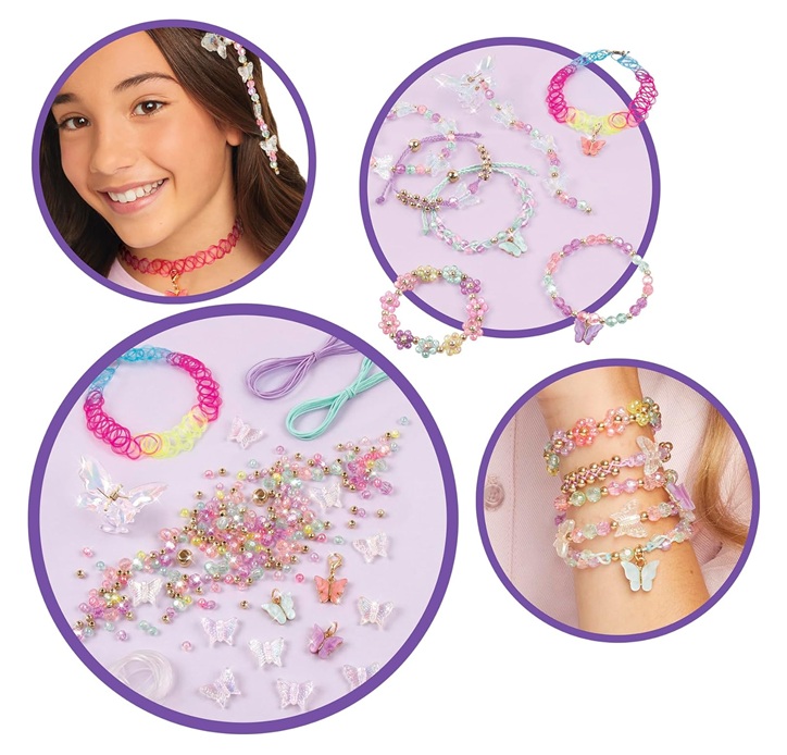 Mélange et associe l'assortiment de perles, de breloques et de fils nylon pour créer 5 bracelets tendances aux couleurs printanières grâce à ton plateau de création. Inclut également une pince à cheveux papillon à personnaliser et un tour de cou élastique dégradé.