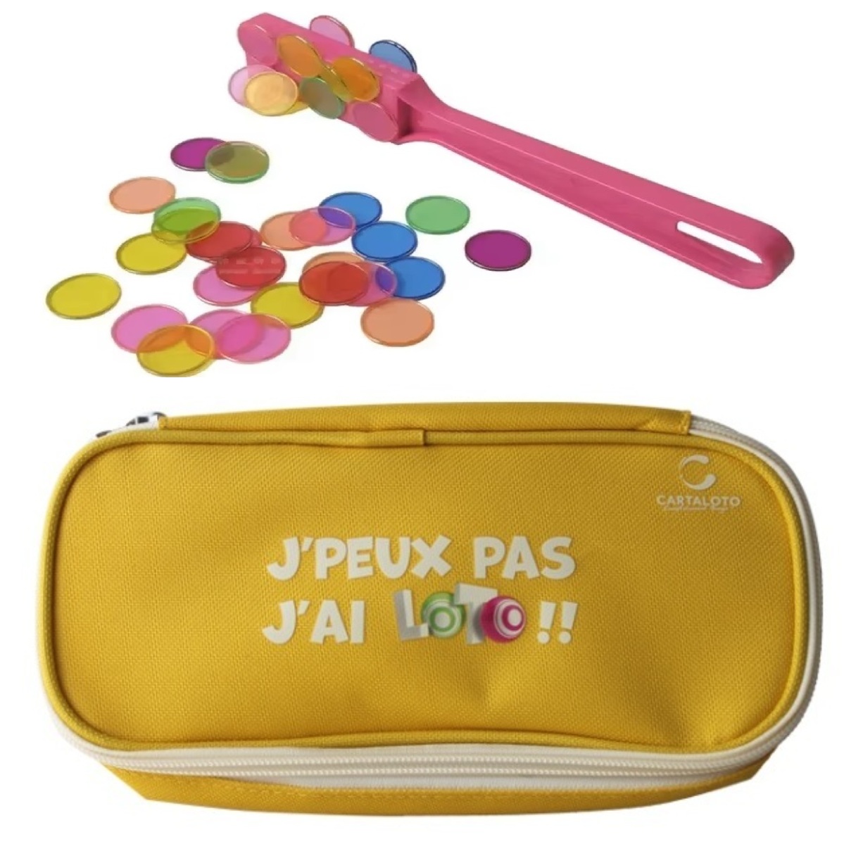Kit loto bingo 3 en 1 : trousse jaune+ baton magnetique rose + 100 pions - Cartaloto - accessoires jeu, materiel