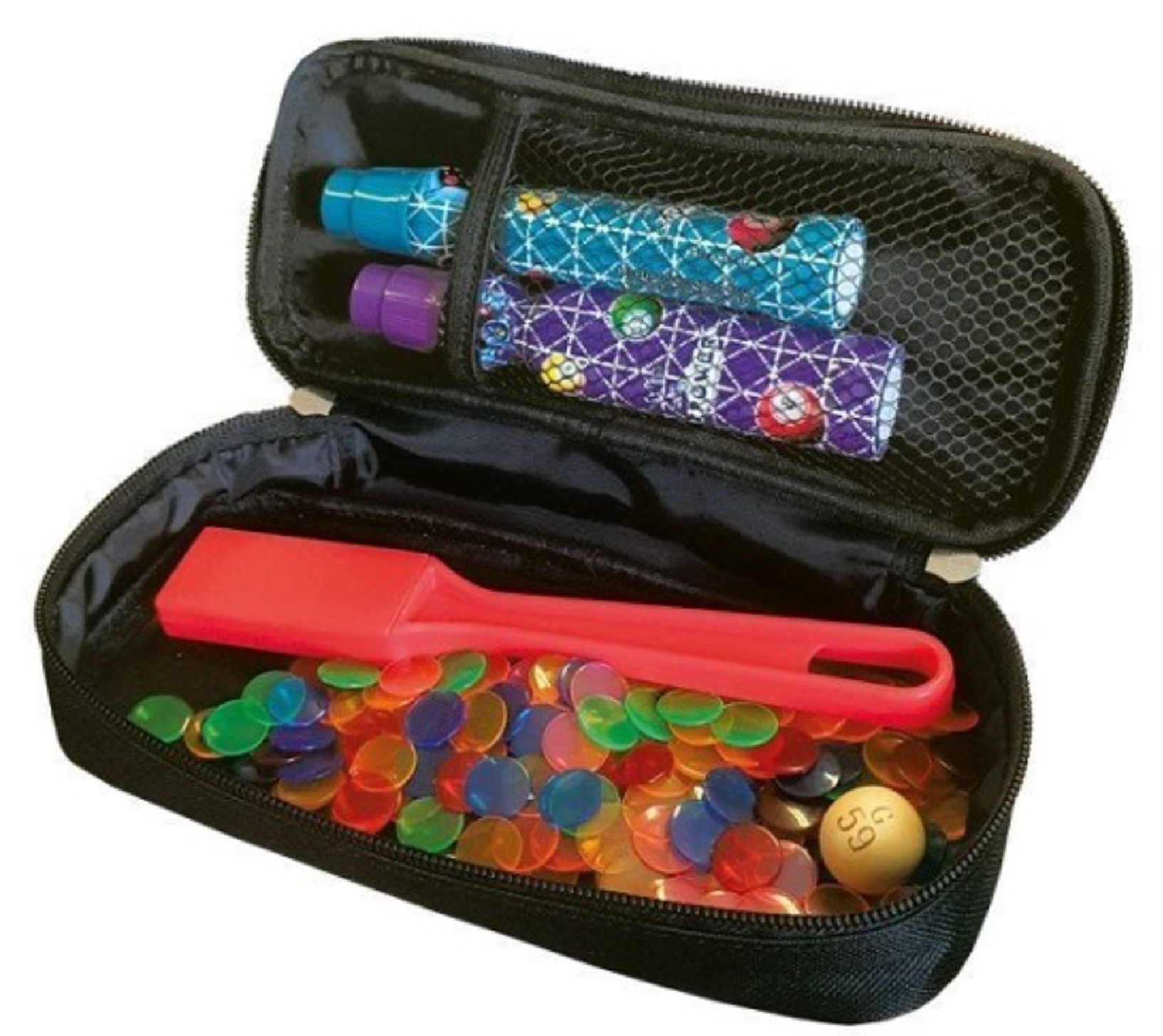 Indispensable ! Ce kit complet permet d’avoir sous la main vos accessoires de loto et bingo dans une trousse pratique et original au message imprimé "J'peux pas J'ai loto".