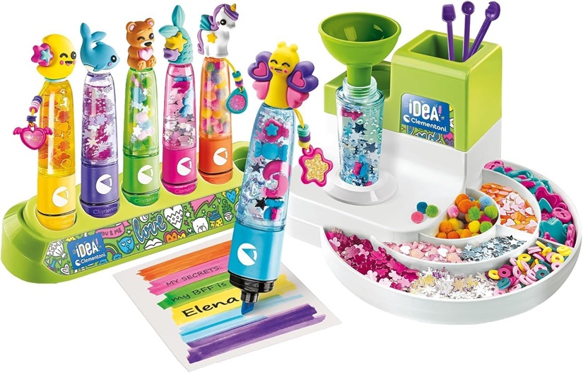 Ce coffret te permettra de créer et de personnaliser des surligneurs fluos avec plein d’accessoires et de décorations inclus (pompons, paillettes...).