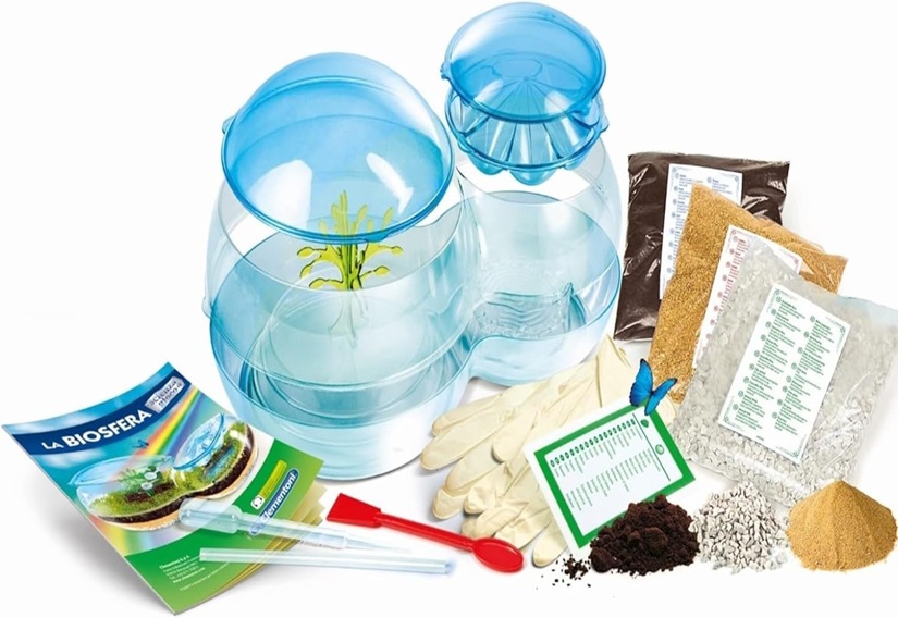 Contenu : sachet de graines, petite spatule, pipette, gants en latex, paille, arbre pour plantes grimpantes, disque des nuages, base de la biosphère, partie centrale, coupoles, sachet de tourbe, sachet de sable, sachet de graviers, manuel illustré.