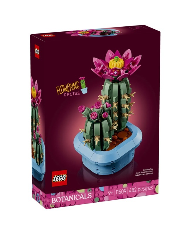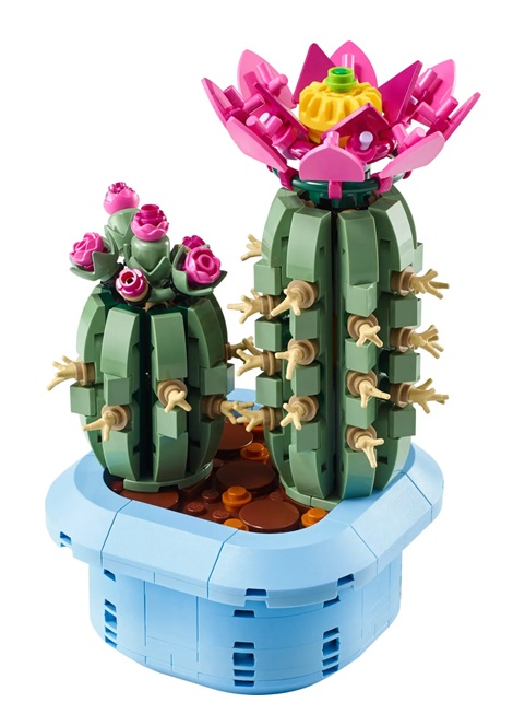 - 2 cactus sont à construire : le plus grand, en pleine floraison, présente au sommet une fleur rose avec un cœur jaune, et le plus petit présente des boutons floraux roses à différents stades. Les cactus sont d'un vert réaliste et ils sont présentés dans un pot bleu pastel.