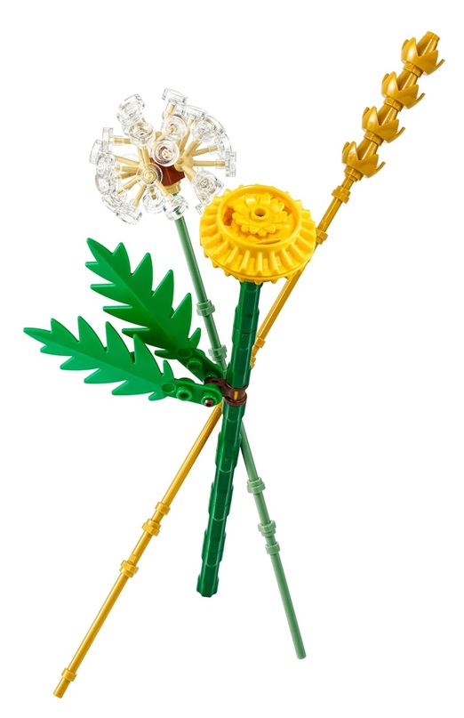 - Ce bouquet de fleurs sauvages bourgeonne de détails réalistes. Il se compose d’une fleur et d’une tête de pissenlit ainsi que d’un épi de blé.