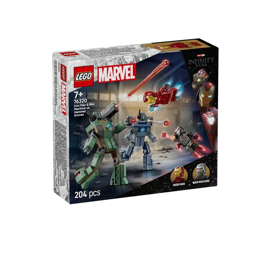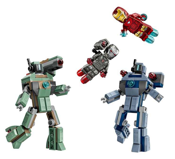 - Les minifigurines incluent Iron Man avec des blasters bleus aux mains et aux pieds et des armes à rayon laser, ainsi que War Machine avec des blasters rouges aux mains et aux pieds et un lance-tenons.