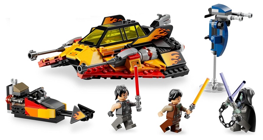 - 3 minifigurines armées sont incluses : Sig Greebling avec un sabre laser, Dark Dev avec un sabre laser et Solitus avec un double sabre laser à chaîne.
