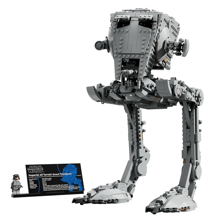 - Ce véhicule en briques se complète d’une plaque descriptive et d’une minifigurine exclusive de pilote d’AT-ST (avec écusson impérial imprimé sur les bras) pour créer une décoration fascinante.