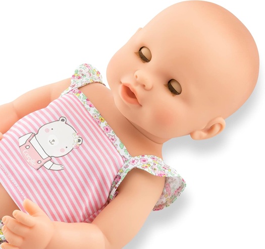 Le poupon tient assis seul, a le corps en vinyle et les yeux dormeurs. Il est habillé d’un joli bloomer fleuri et d’un débardeur et d’un débardeur rayé rose à l'imprimé ourson.