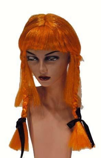 Cette perruque aux cheveux orange dotée de tresses et d’une frange est idéale pour compléter bon nombre de déguisements.