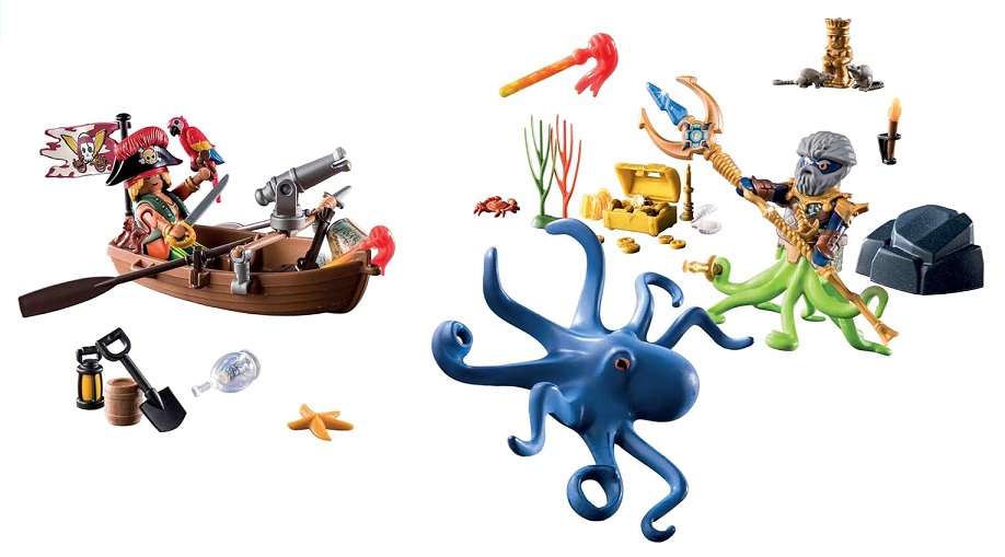 Le pirate a mis la main sur une carte au trésor menant à un coffre rempli d'or pirate précieux. Naviguant à bord de son canot, il affronte non seulement une pieuvre géante, mais aussi Le seigneur Pieuvre Noire, redoutable chef de la tribu des monstres marins !
