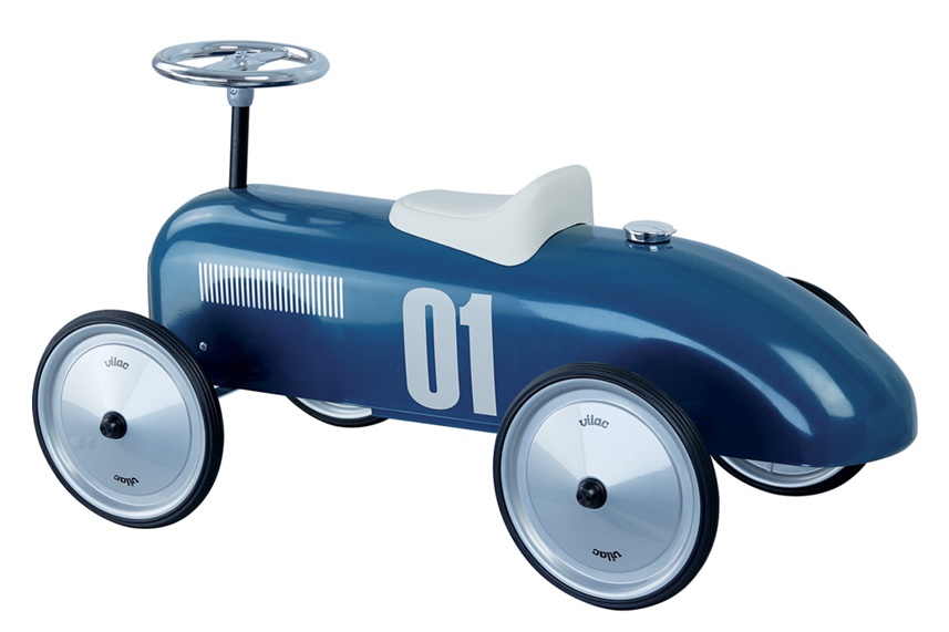 Ce porteur voiture de course rétro en métal bleu possède un volant directionnel et de grandes roues en caoutchouc qui garantissent sa stabilité et permettent à l’enfant d’avancer en toute sécurité.