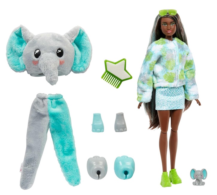 Découvre un adorable costume d’éléphant bleu et gris tout doux et vraiment adorable. Soulève la tête du costume pour dévoiler une poupée Barbie aux longs cheveux colorés, avec des points d’articulation et des détails étincelants sur le visage.