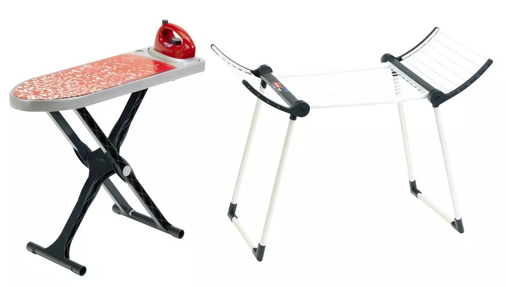 Ce set de buanderie sous licence Videla se compose d'un étendoir pliable, d'une planche à repasser réglable en hauteur et d'un fer à repasser.