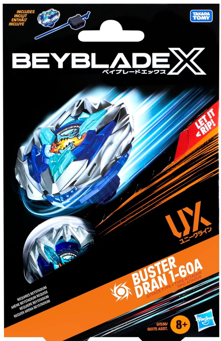 On peut vivre le frisson de la prochaine génération d'arènes, de lanceurs et de toupies Beyblade avec le Starter Pack Beyblade X Buster Dran 1-60A UX qui inclut une toupie à rotation droite de type attaque et un lanceur.