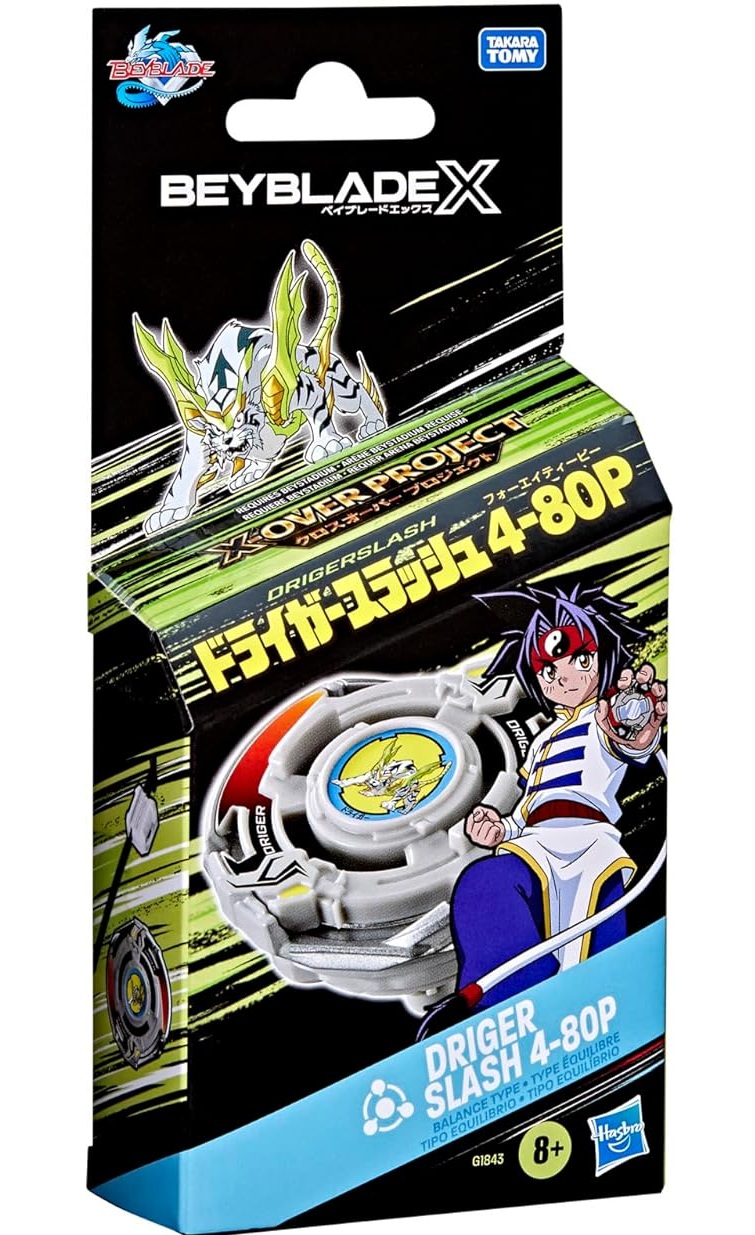 On peut vivre le frisson de la prochaine génération d'arènes, de lanceurs et de toupies Beyblade avec le Starter Pack Beyblade X Driger Slash 4-80P qui inclut une toupie à rotation droite de type équilibre et un lanceur.
