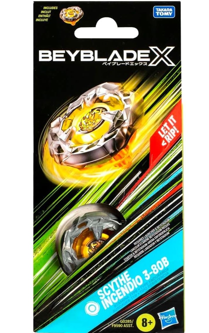 On peut vivre le frisson de la prochaine génération d'arènes, de lanceurs et de toupies Beyblade avec le Pack Beyblade X Scythe Incendio 3-80B qui inclut une toupie à rotation de type endurance.