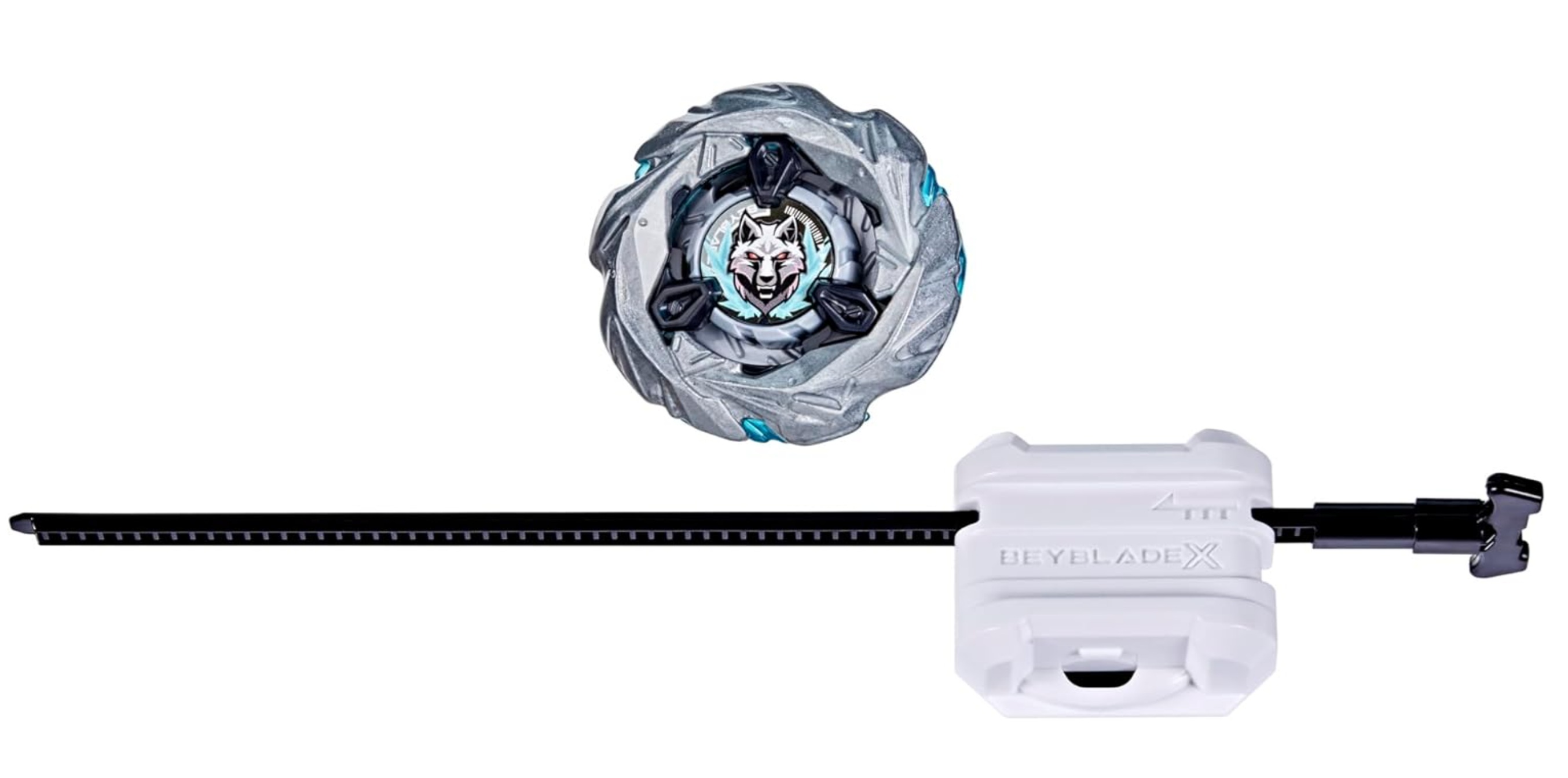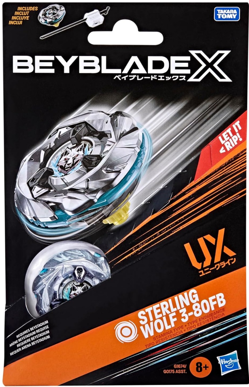 On peut vivre le frisson de la prochaine génération d'arènes, de lanceurs et de toupies Beyblade avec le Starter Pack Beyblade X Sterling Wolf 3-80FB UX qui inclut une toupie à rotation droite de type éndurance et un lanceur.