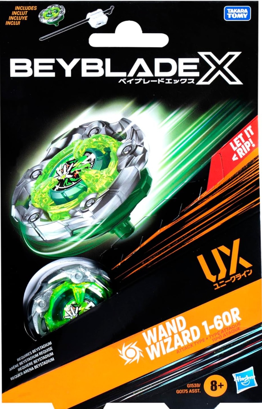 On peut vivre le frisson de la prochaine génération d'arènes, de lanceurs et de toupies Beyblade avec le Starter Pack Beyblade X Wand Wizard 1-60R UX qui inclut une toupie à rotation droite de type attaque et un lanceur.